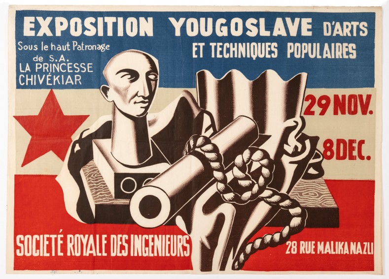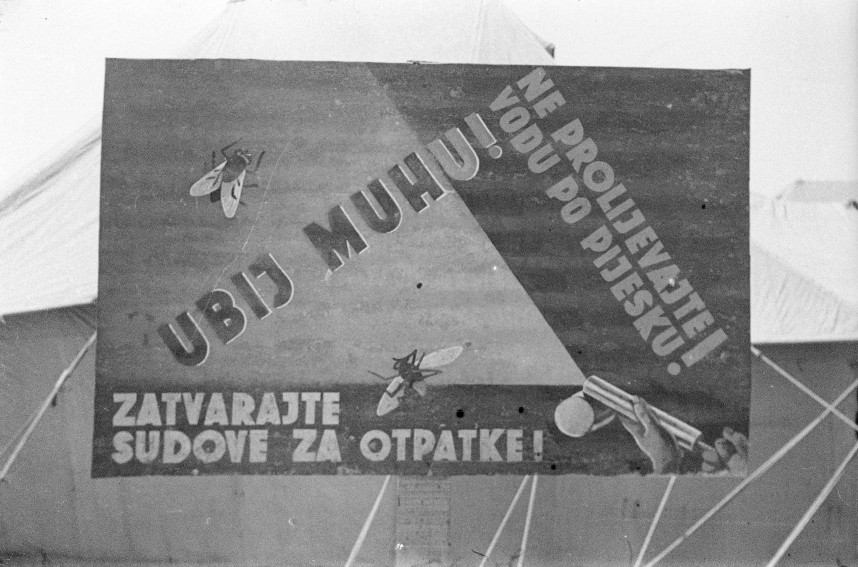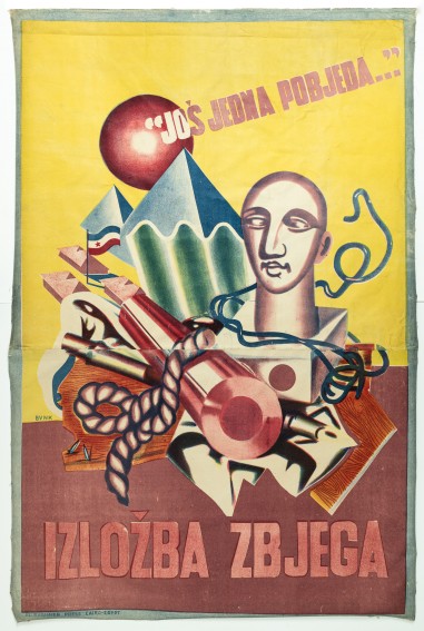 U vizualnom identitetu zbjega posebno mjesto zauzimaju plakati. Većinom su plakati bili crtani ručno i izrađeni u jednom primjerku. Izuzetak su dva plakata za izložbe tiskana u boji u profesionalnim tiskarama izvan logora: plakat za Izložbu jugoslavenske umjetnosti i znanosti, izrađen na francuskom i arapskom jeziku, te plakat za Izložbu zbjega iz 1944. godine. Oba potpisuje Rudolf Bunk, njemački slikar i dizajner čiji rad odlikuje konstruktivistička disciplina tipografije i geometrijska kompozicija. Osim tiskanih radova, Bunk je ručno izrađivao plakate i edukativne panele, poput poznatog billboarda „Ubij muhu”, kojim se poticala higijenska svijest stanovnika logora.