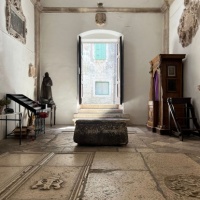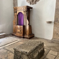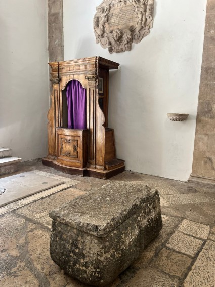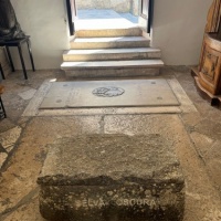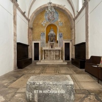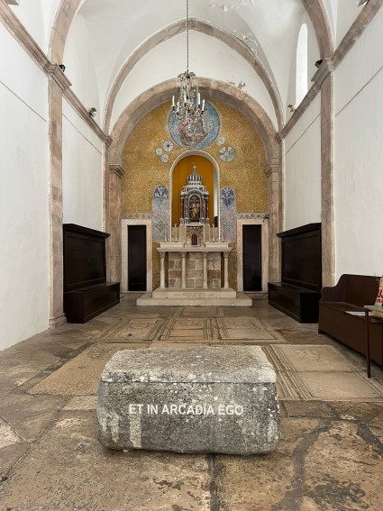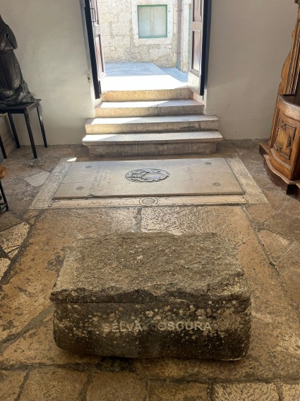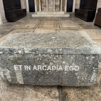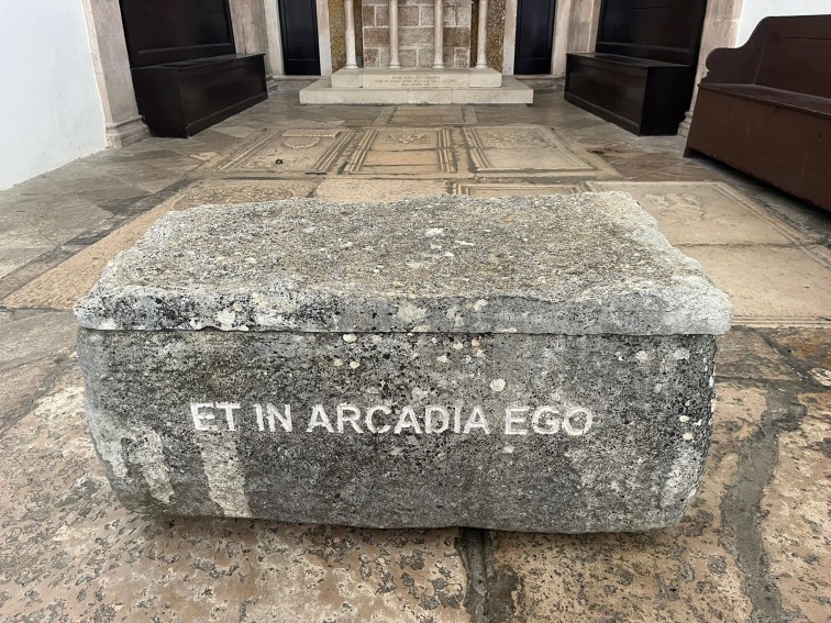 Tijekom godinu dana u unutrašnjosti crkve nalazi se i strani objekt: svojevrsna škrinja izrađena od grubo obrađenog lokalnog vapnenca, široka nešto više od metra i na ugodnoj visini za sjedenje. Teška oko četvrt tone, ima zapreminu od 250 litara i prekrivena je kamenom pločom. Na prednjoj strani posjetitelje dočekuju poznate riječi ET IN ARCADIA EGO, uklesane jasnim kapitalnim slovima, dok ih na stražnjoj strani ispraća pomalo zagonetan natpis SELVA OSCURA. Ova intervencija pretvara naizgled banalni strani predmet u artefakt, u umjetničko djelo.