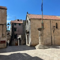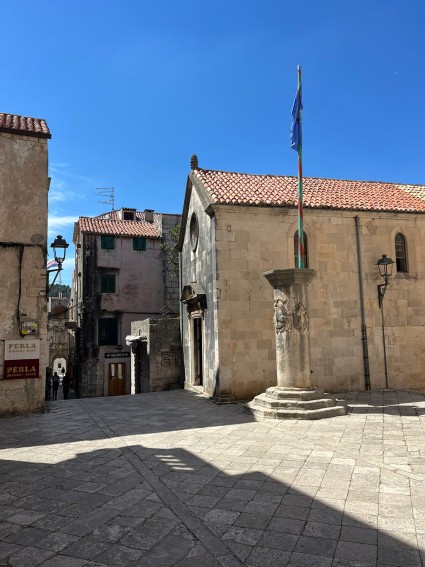 Posjetitelji koji šetaju slikovitim starim gradom Korčule i koji su prošli pokraj veličanstvenog pročelja gotičko-renesansne Katedrale sv. Marka na istočnoj strani Trga sv. Marka vjerojatno bi previdjeli malu crkvu na njegovoj južnoj strani, da nije elegantnog stupa ukrašenog grbom na osmerokutnom, stepenastom postolju na njezinoj sjevernoj strani, okrunjenog osmerokutnim kapitelom, u čiju je stražnju stranu urezan okomiti utor za jarbol zastave. Ondje, visoko iznad krova crkve, vijori zastava Korčule. Kada je stup podignut 1515. godine, Crkva Gospojina, posvećena Bezgrešnom začeću Marijinu, već je stajala 37 godina.