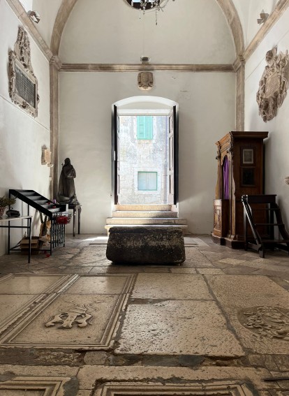 Jednostavna renesansna građevina, koja potječe iz posljednje četvrtine 15. stoljeća, posvećena je 1483. godine od strane biskupa Malumbre i povjerena kao grobno mjesto usko povezanim, utjecajnim obiteljima Ismaelis i Gabrielis. Njihove palače nalaze se u blizini: palača Gabrielis, danas gradski muzej, na jugozapadnoj strani Trga sv. Marka, te palača Ismaelis, danas podijeljena u apartmane za odmor, gotovo neposredno uz zapadni izlaz u Ulicu Ismaelis. Ulaskom u Crkvu sv. Marije kroz portal, koji je danju uvijek otvoren i ima stilski siguran stepenasti zabat, na uskom prolazu koji vodi prema uličici spomenutoj u gradskom statutu iz 1241., tri stepenice vode dolje u lađu dugu dva traveja, presvođenu križnim svodovima, na čijem su podu sačuvane brojne nadgrobne ploče obitelji Ismaelis. Prepoznatljive su po grbu izvorno mletačke obitelji: tri svijetle pruge nagnute udesno ispod tornja koji drže lavovi, kao i na njihovoj palači. Na sjeveru, unutrašnjost crkve završava baroknim oltarom i skulpturom Djevice Marije, okruženom mozaikom nizozemskog umjetnika Louisa Schrikkela (1964./67.).